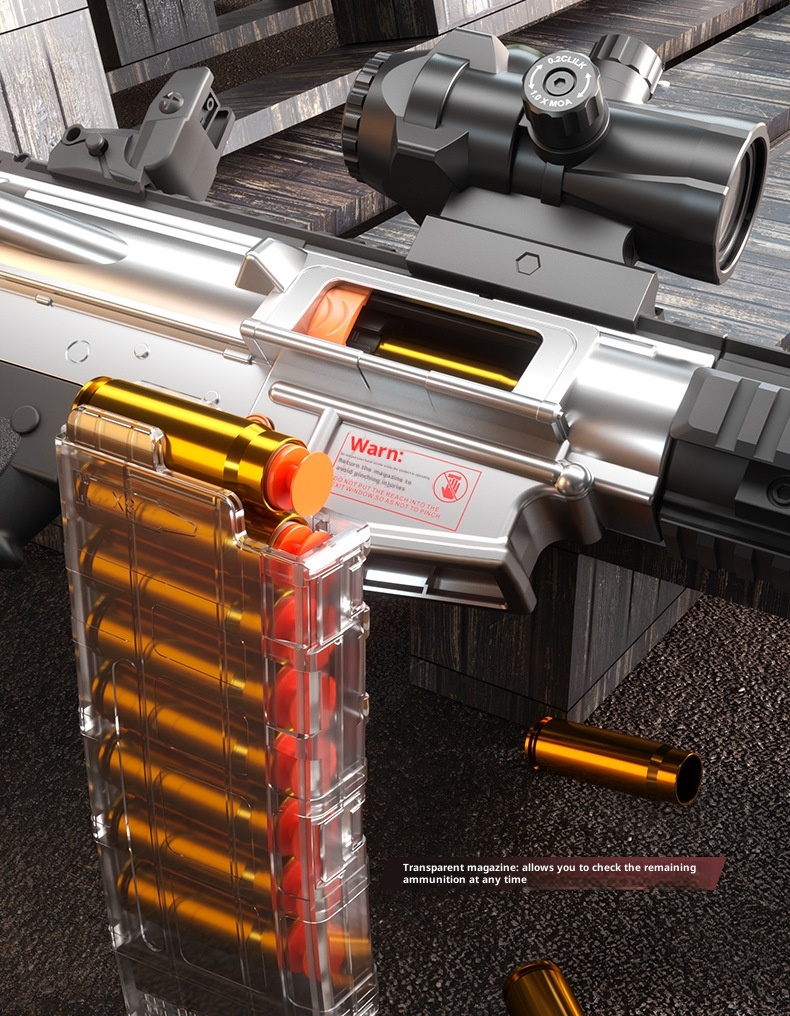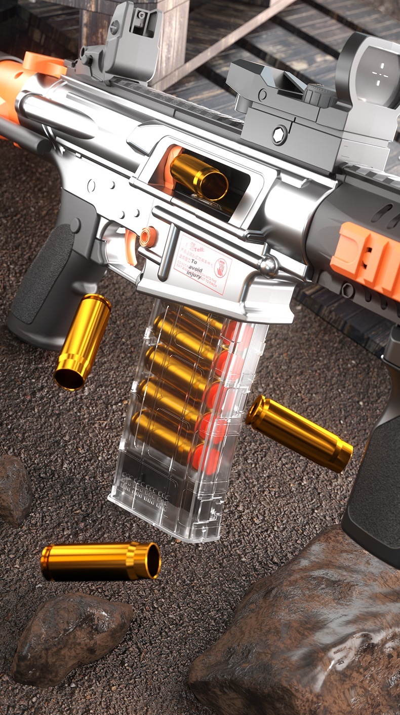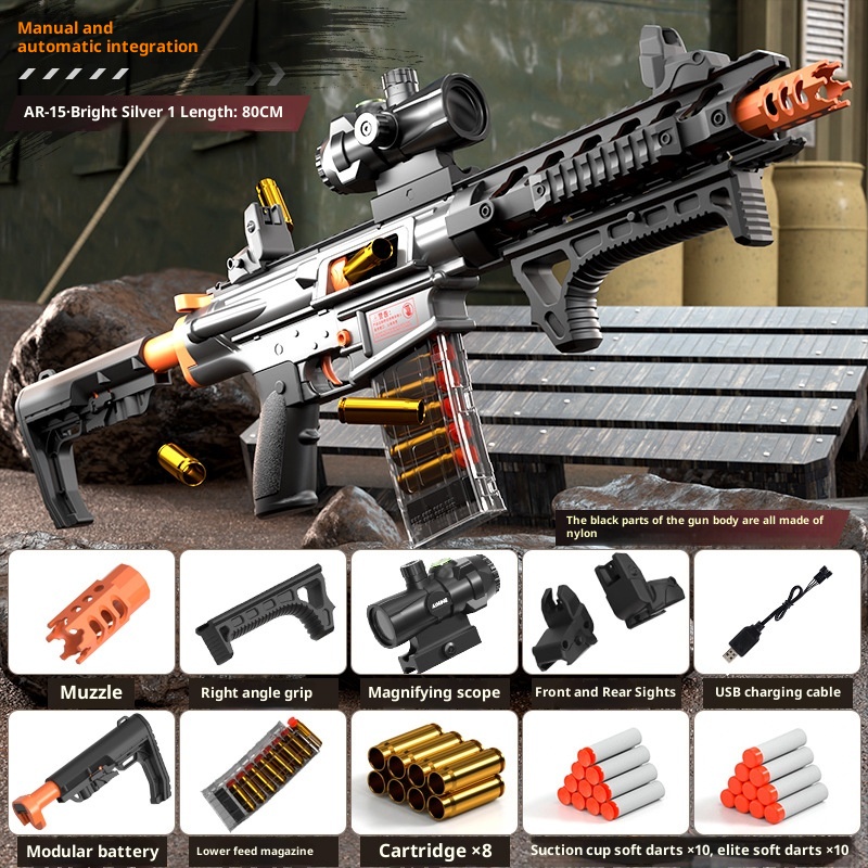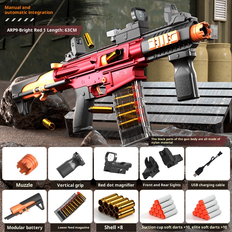 Toy gun * 1 Gun muzzle * 1 Vertical grip * 1 Red dot magnifying glass * 1 Front and back alignment * 1 USB charging cable * 1 Modular battery * 1 Supply ammunition compartment * 1 Shell case x8 Suction cup soft spring * 10 Elite Soft Bullet * 10