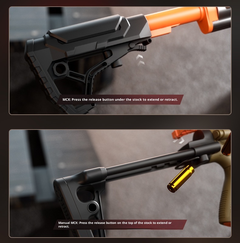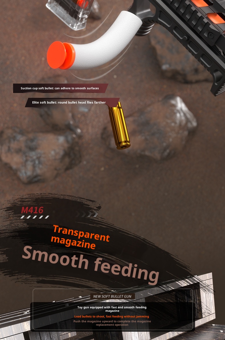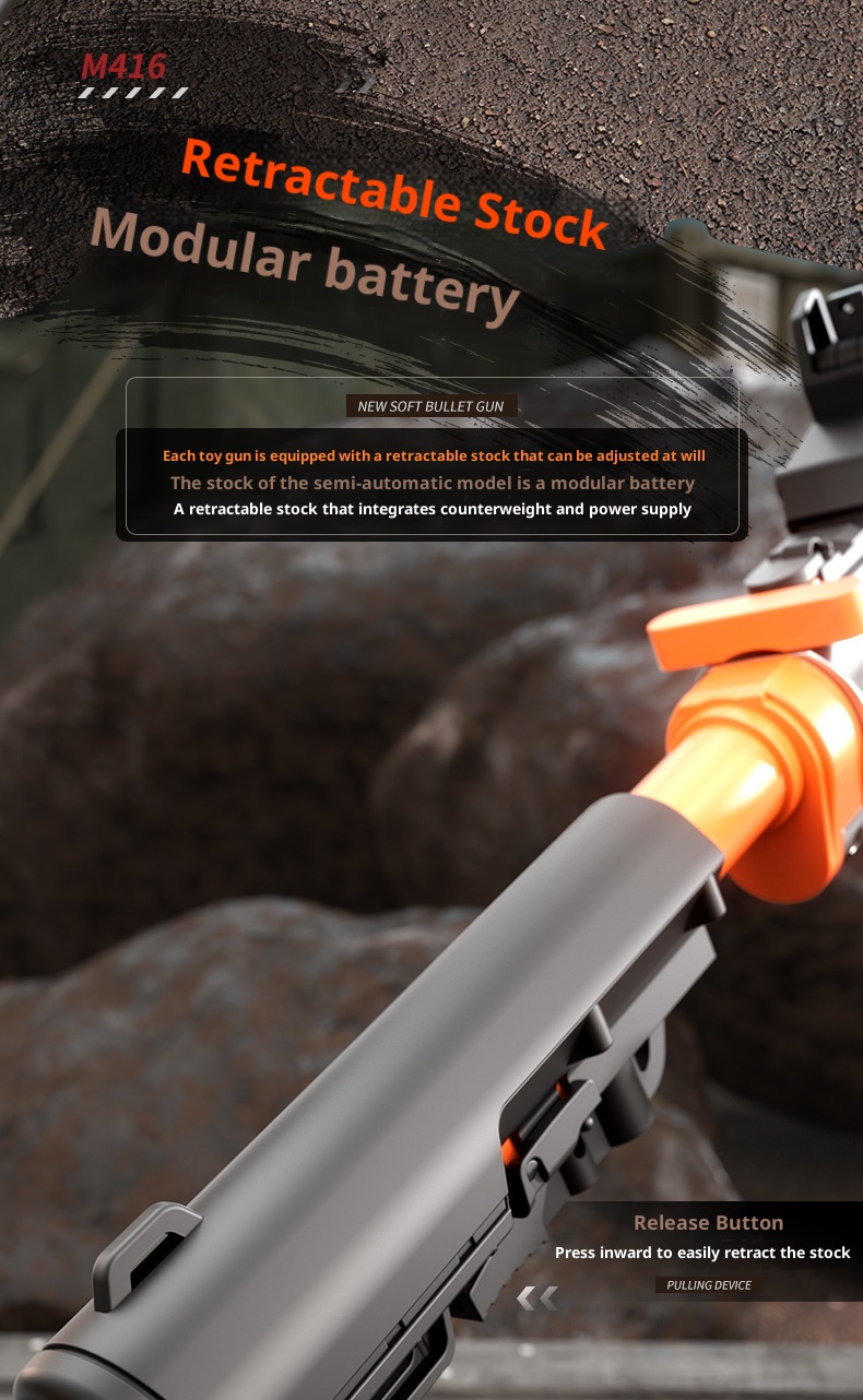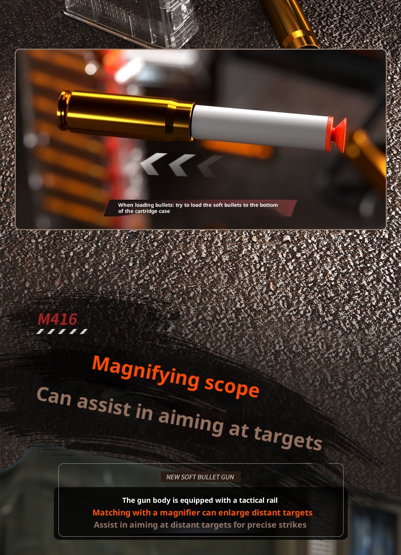 Toy gun * 1 Gun muzzle * 1 Vertical grip * 1 Red dot magnifying glass * 1 Front and back alignment * 1 USB charging cable * 1 Modular battery * 1 Supply ammunition compartment * 1 Shell case x8 Suction cup soft spring * 10 Elite Soft Bullet * 10